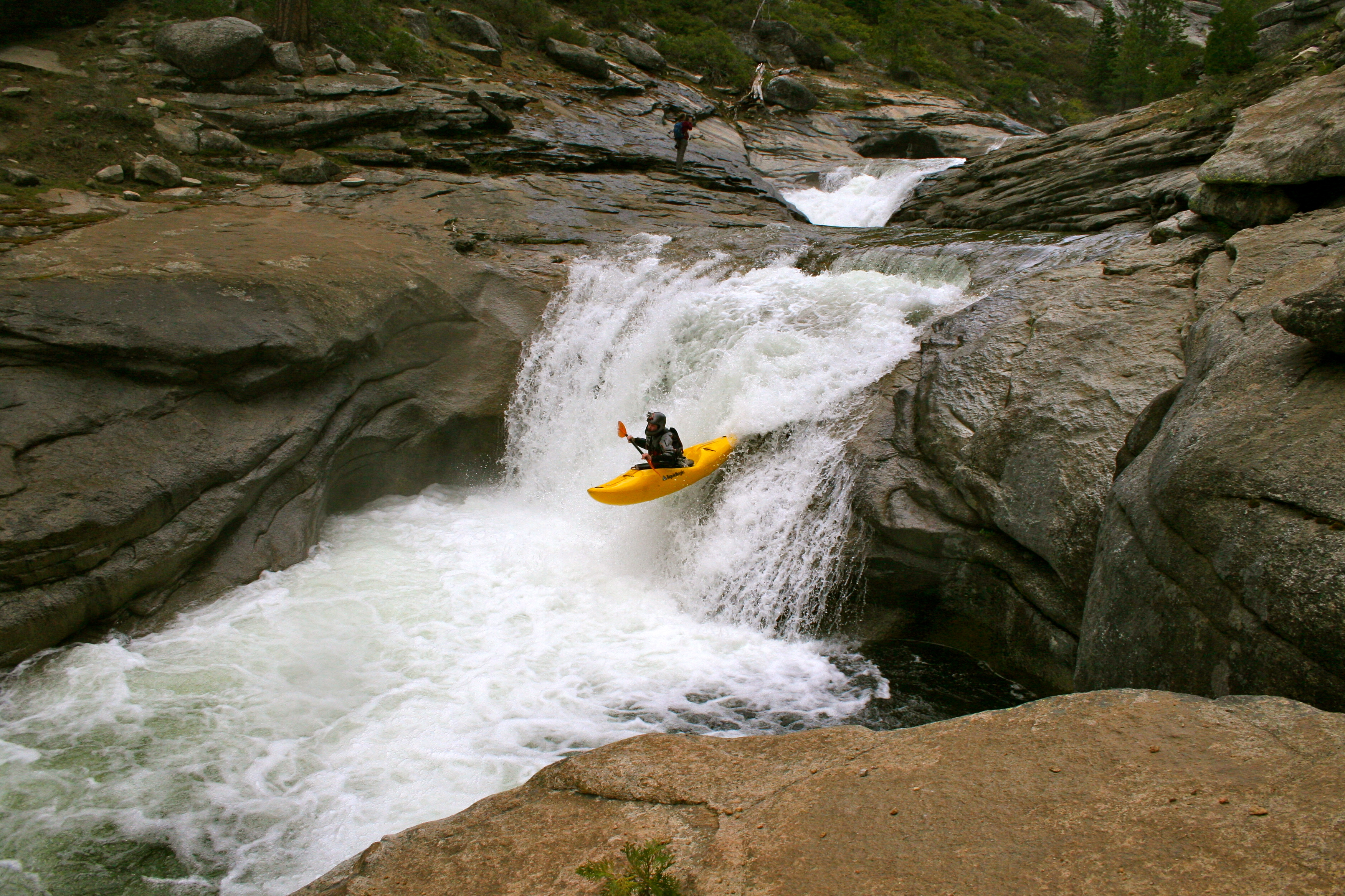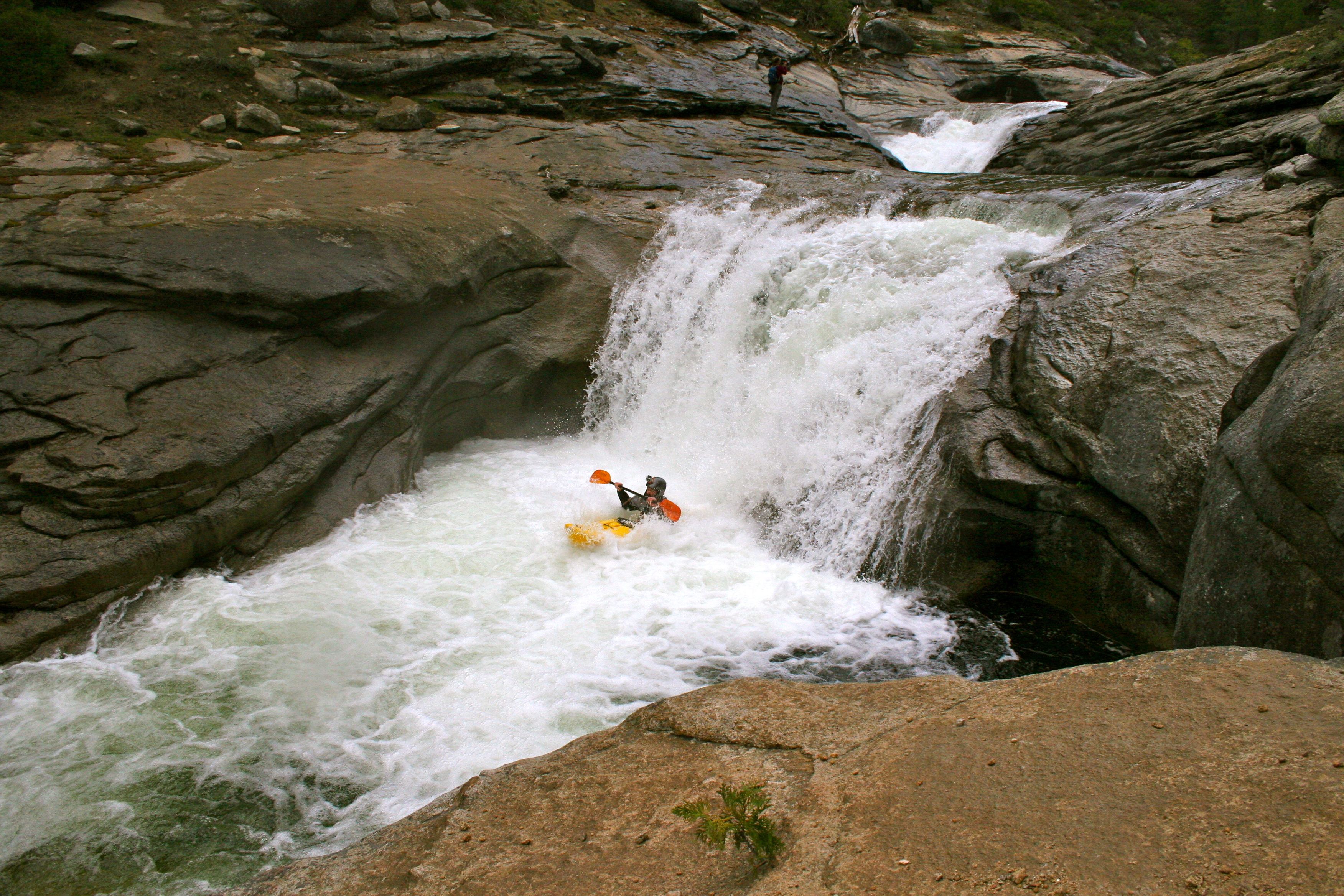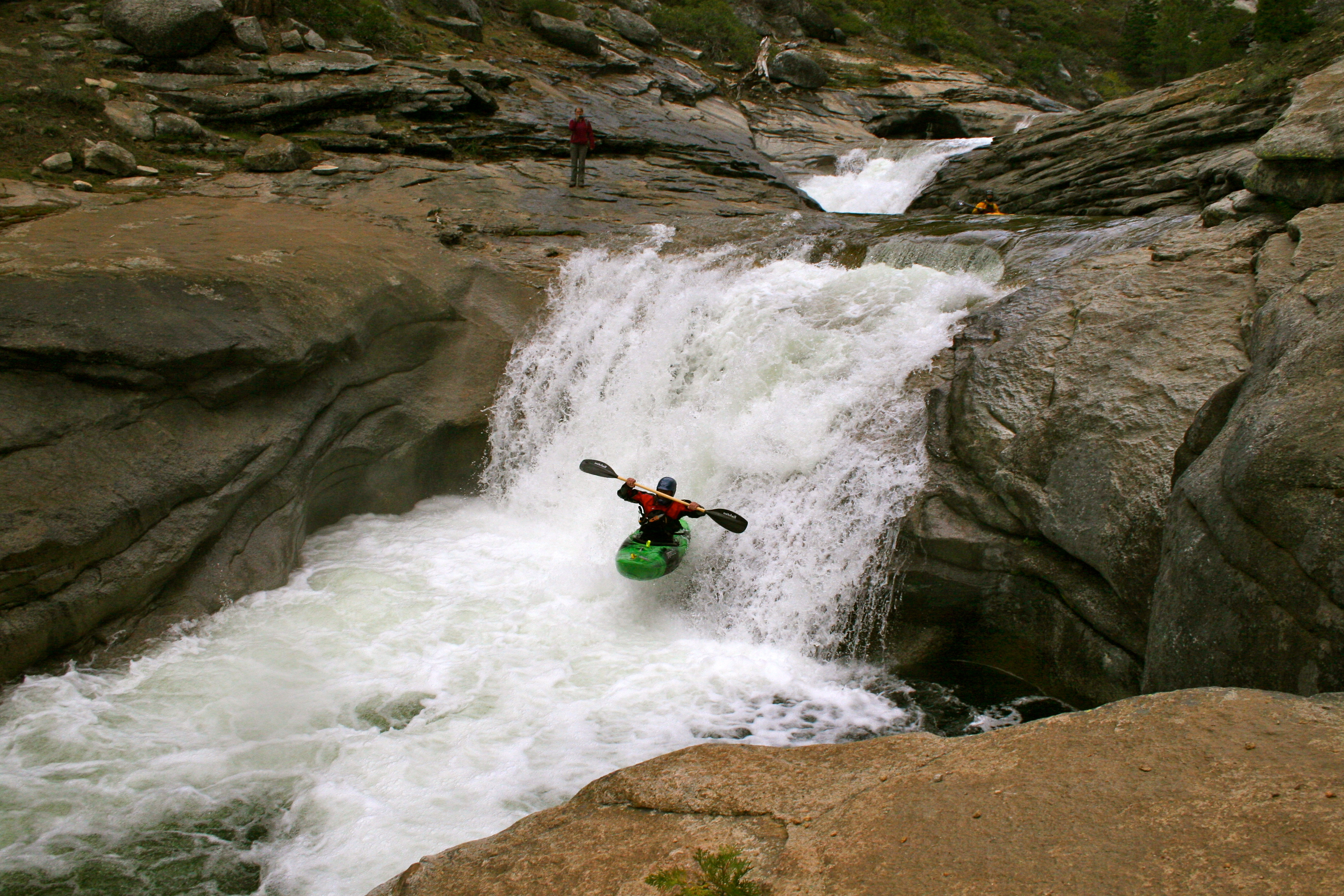 South Silver is known to paddlers all over the country. It drops about 680 vertical feet over the 1 mile runnable section of the creek. The creek is packed full of clean bed rock drops, the highest of which is about 70 feet tall. For me personally this creek represents both the ultimate mental challenge and training ground. People often don’t believe me when I say that my two biggest fears in the world are heights and water, but it is true. Separately I can usually manage them pretty well, but both at the same time can be very demanding on my ability to stay present and focused. I guess that’s why I like going kayaking so much. There are few things in life as exhilarating as staring down that which scares the hell out of you and breaking through that fear to do what must be done. Everything goes into a sort of tunnel vision and you experience a level of awareness that most people never know. I didn’t get to get on south silver last year and with the low snow pack in the Sierras I had figured this year wasn’t going to happen either. I was stoked when Cyrus said he wanted to go up and he had a good feeling it would be in. I half expected to get skunked but we got there to find a great water level and fair weather, all the makings of an awesome weekend. Flows were medium high ish. I think this was the highest I’ve ever had although it’s been so long since my last visit it’s a little hard to compare. The day after we left it snowed up there so I’m hopeful I will be able to get another run or two in after the Reno River Festival this weekend.