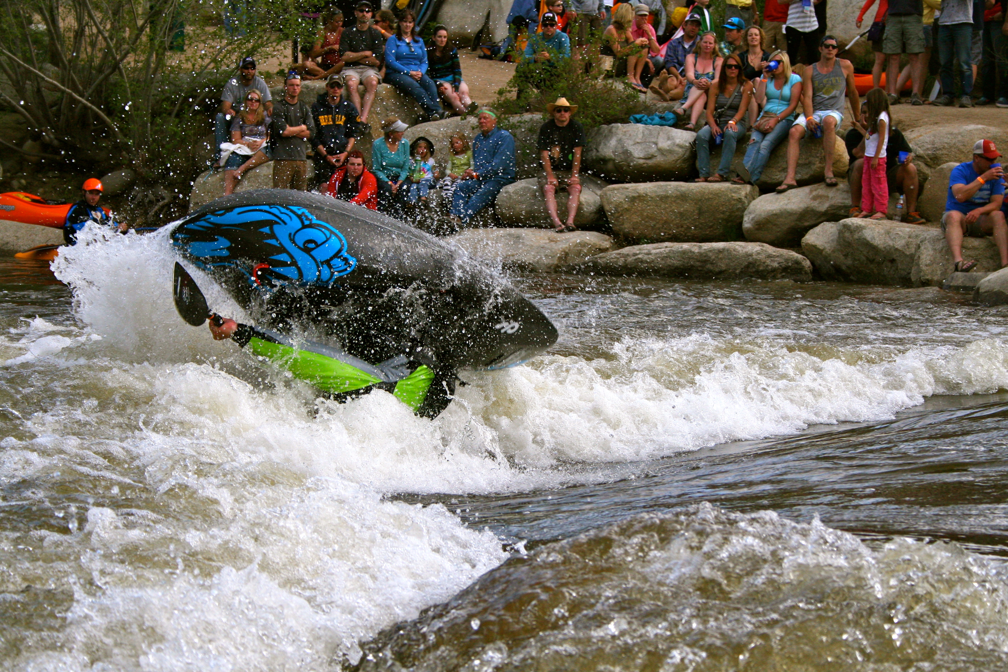 Paddle fest is always one of my favorite events every year. Buena Vista is an awesome little town with an amazing white water park. They have several features that are good at a wide range of levels. The brewery is in the park and the camping is free. The town is surrounded by huge mountains including about a half dozen 14ers. There are hot springs just a few minutes away to aid the sore muscles after a long day of paddling. If the Arkansas river had flow all year I would live in BV for sure. This year we had very low water right up to the day of the comp. The weather turned warm on Thursday in time to bring us rising water levels all through the weekend. We competed in a feature that was a bit better than last year’s. The hole in BV isn’t very retentive but it is mellow and deep which makes it easy to set up tricks and you don’t worry about hitting the bottom.