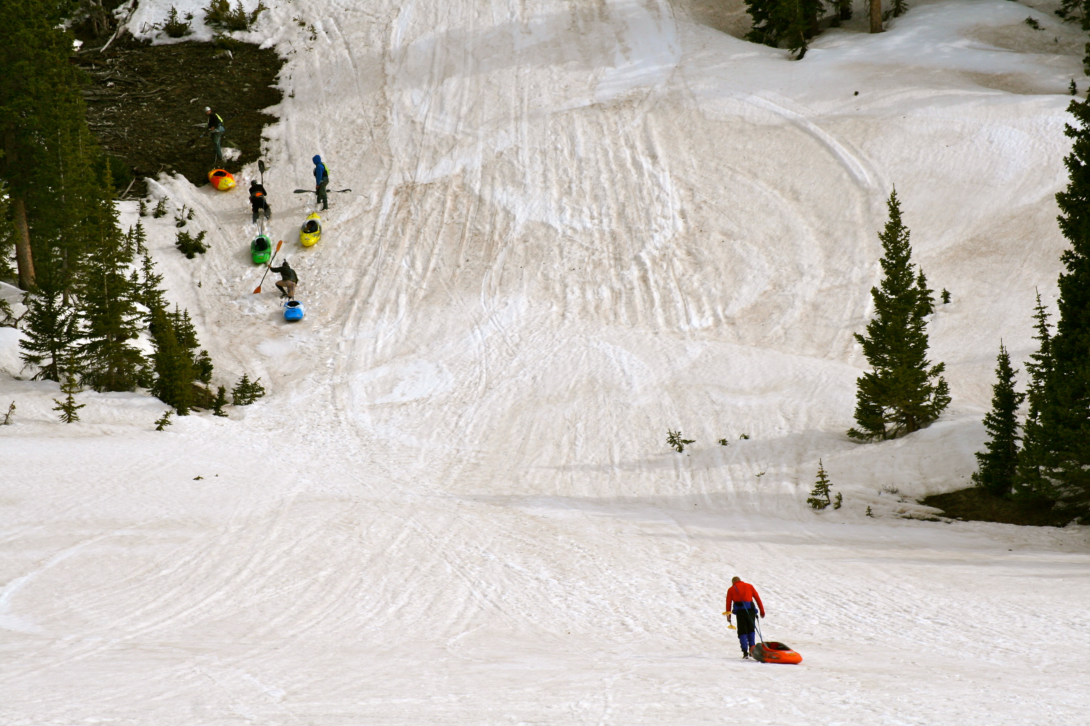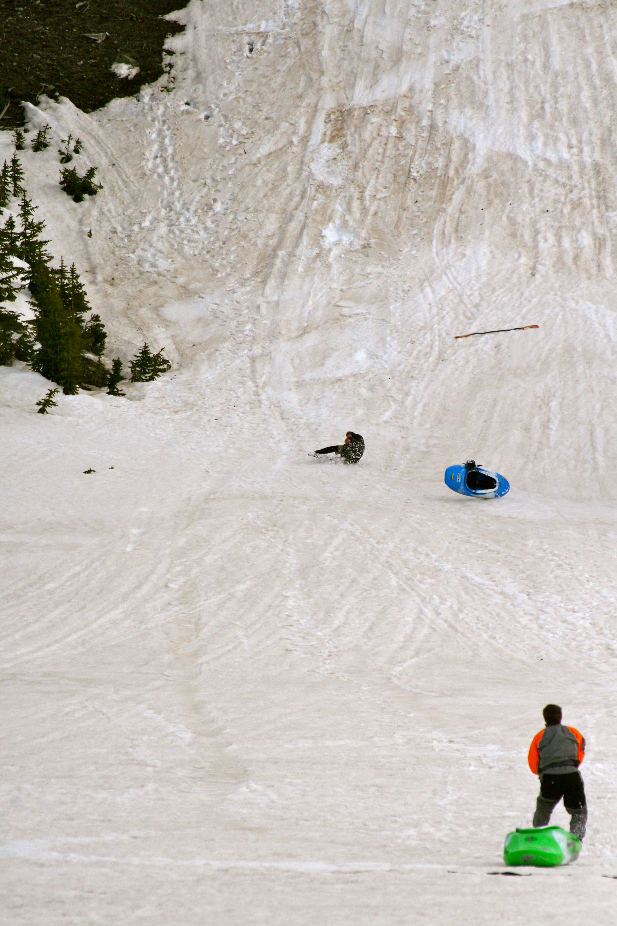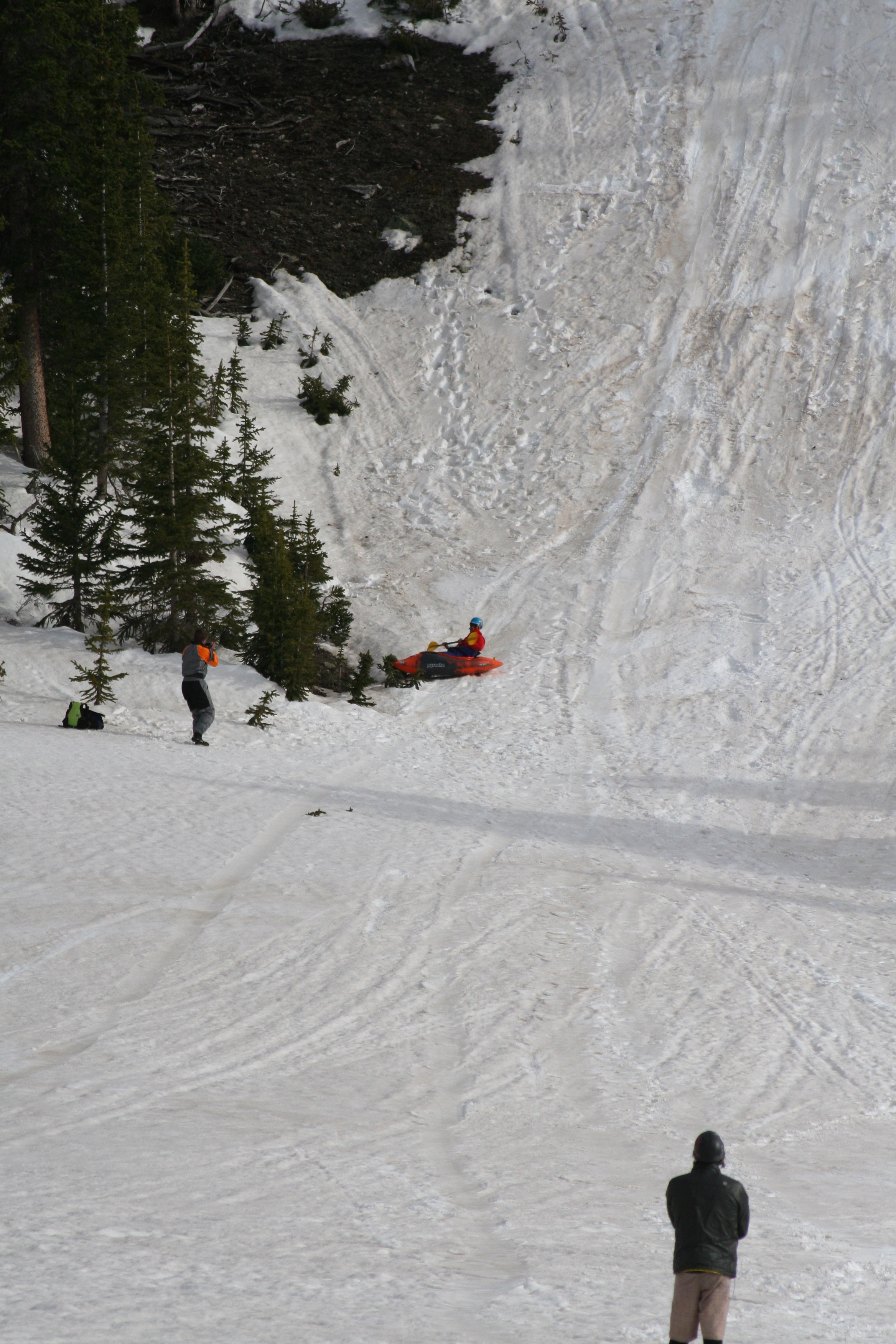 After the festival we paddled from Pine Creek all the way back to BV. About 12 or 13 miles I think. It was long and cold again. The crew rallied to Crested Butte Monday evening to hit OBJ. Amy and I had to make some stops for provisions and such so we opted out of Monday evening dusk run and met up just as they took out to camp. Our plan was to run it again Tuesday and get some photos at the big one but it got colder than the surface of the moon Monday night and the snow stopped melting which means the water stopped flowing. We woke up Tuesday sad to see such low water. We decided to head up this other creek (I forgot its name.) to scout a stout 7 tiered waterfally drop thing, mostly to kill time hoping that water would come back up. Sadly, it didn’t and Amy and I had driven all the way to OBJ to not kayak. Demshitz was determined to go kayaking though, so we decided that if the snow would not melt and come down to us we will go up into the mountains and kayak it in its solid form. Technically it is still white water. We drove up cottonwood pass and found a good stout slide that dropped about 200 vertical feet. Mike fired it up first followed closely by Craig. We were all pretty stoked until Matt went and ate shit pretty hard. He came flying out of his boat and went rag dolling down the hill. Fortunately, he was ok. Probably got some bruises but no real injury. Dave had a close call with some trees but pulled it off. I was completely out of control right from the start and barely kept it open side up. I hit the small pines that Dave narrowly avoided but it wasn’t too bad. It just sent me spinning. Some of you may recall from the Mt. Rose snow boater X a few years ago that I crashed through the fence and nearly boofed right off the mountain. Given my track record with snow kayaking I’d say this was a huge success just because I stayed on the right side of the hill. After our class V sled ride we went back to BV to spend a night and today ran Pine Creek and the numbers again. Now I am finally sitting at my computer and getting an update out. We head to Lyons tomorrow for the Lyons Outdoor Games. I will try to be a bit more punctual in getting that update to you. There is just so much kayaking to do. You understand, right? Anyway, thanks for reading. I hope you enjoy the pictures.