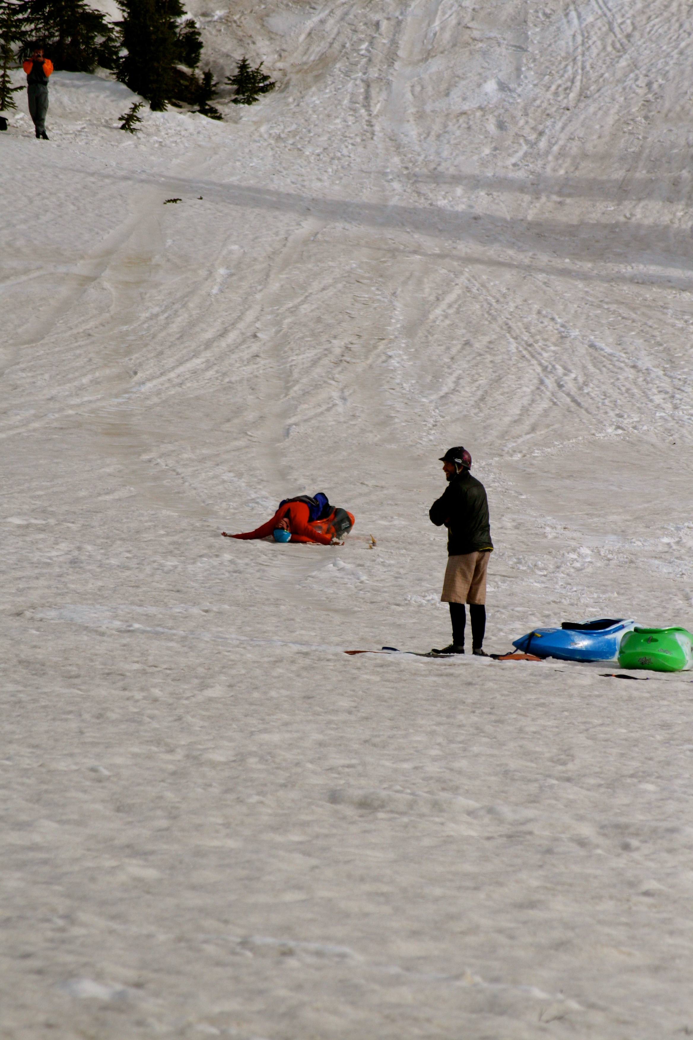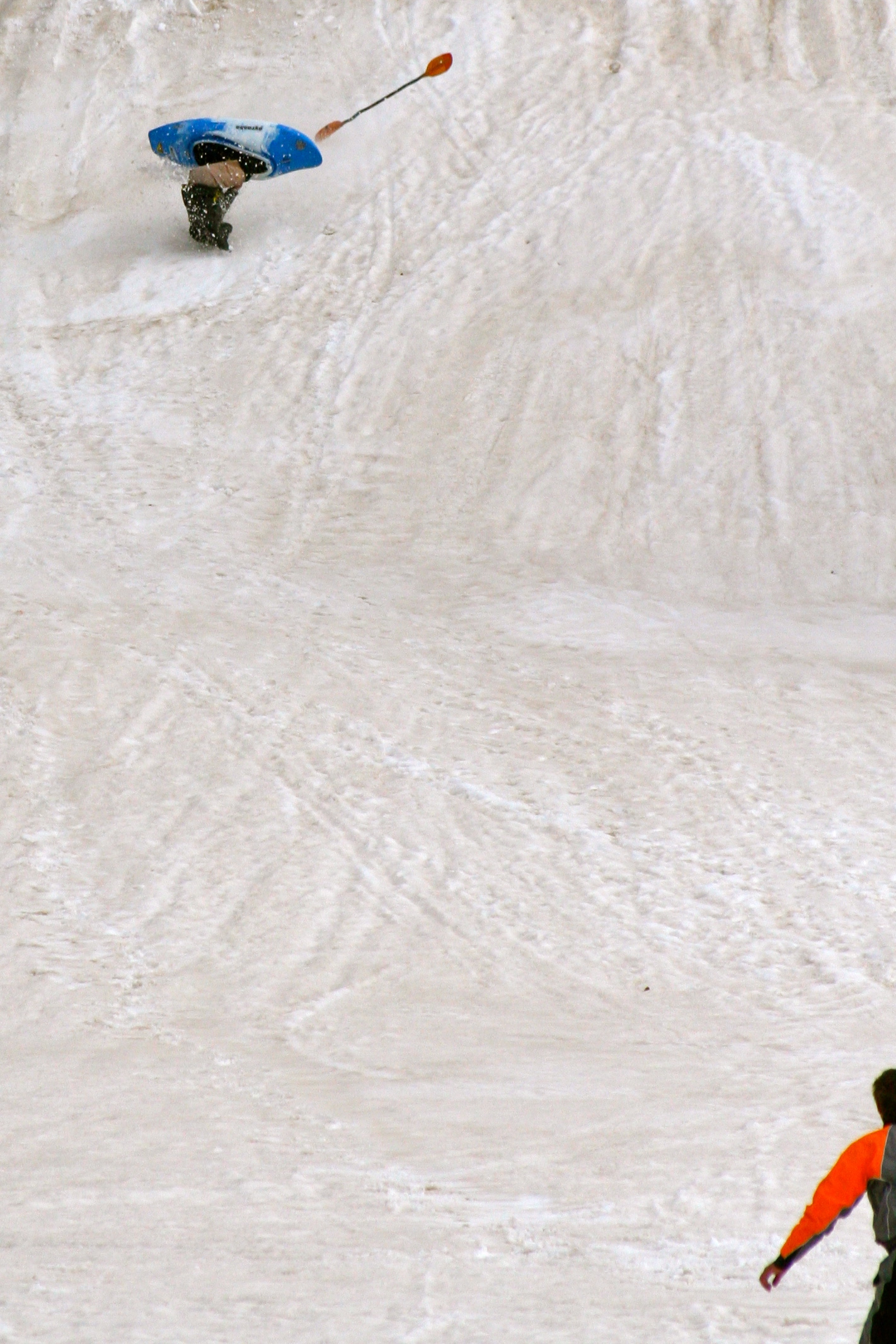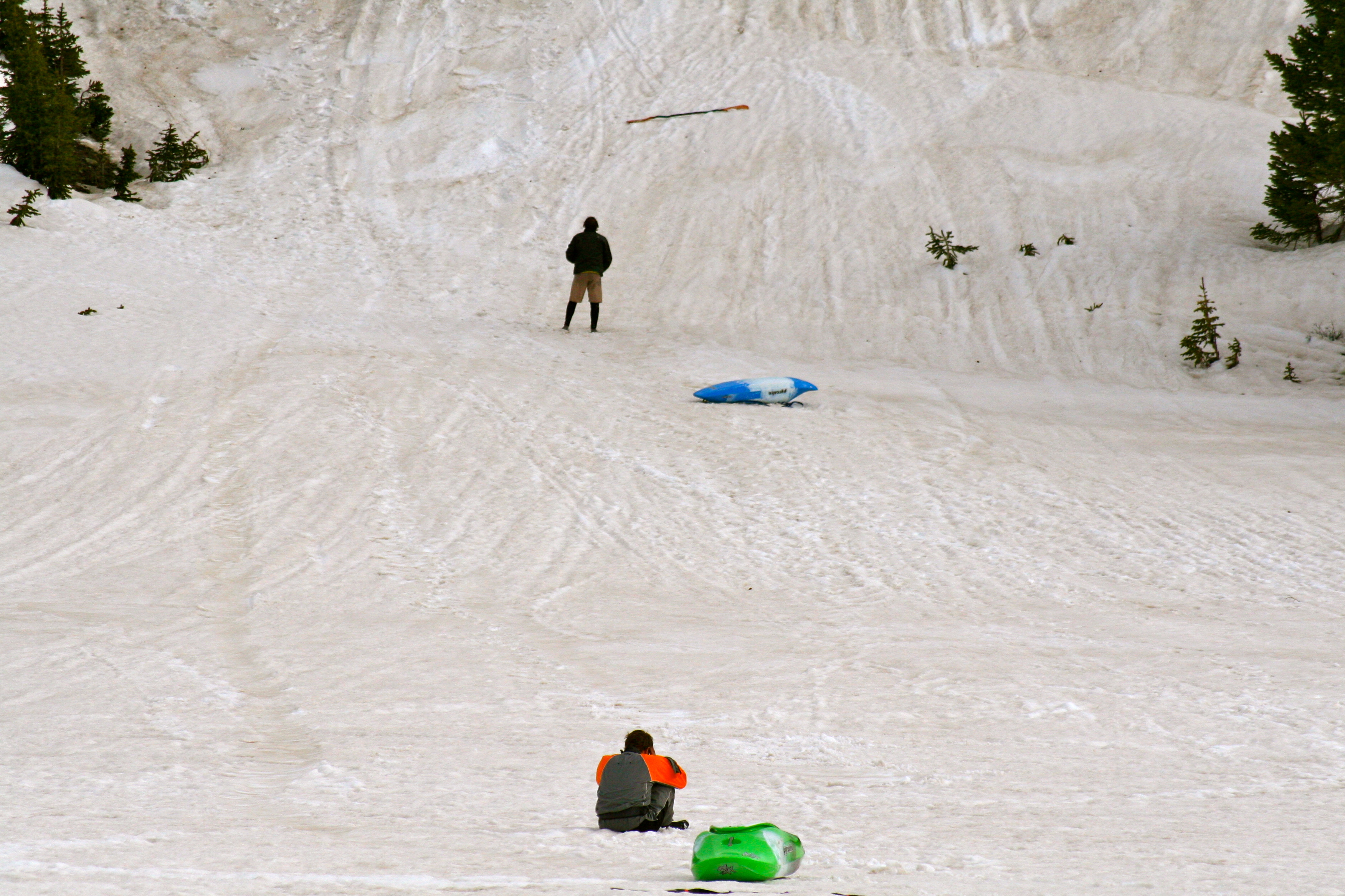 After the festival we paddled from Pine Creek all the way back to BV. About 12 or 13 miles I think. It was long and cold again. The crew rallied to Crested Butte Monday evening to hit OBJ. Amy and I had to make some stops for provisions and such so we opted out of Monday evening dusk run and met up just as they took out to camp. Our plan was to run it again Tuesday and get some photos at the big one but it got colder than the surface of the moon Monday night and the snow stopped melting which means the water stopped flowing. We woke up Tuesday sad to see such low water. We decided to head up this other creek (I forgot its name.) to scout a stout 7 tiered waterfally drop thing, mostly to kill time hoping that water would come back up. Sadly, it didn’t and Amy and I had driven all the way to OBJ to not kayak. Demshitz was determined to go kayaking though, so we decided that if the snow would not melt and come down to us we will go up into the mountains and kayak it in its solid form. Technically it is still white water. We drove up cottonwood pass and found a good stout slide that dropped about 200 vertical feet. Mike fired it up first followed closely by Craig. We were all pretty stoked until Matt went and ate shit pretty hard. He came flying out of his boat and went rag dolling down the hill. Fortunately, he was ok. Probably got some bruises but no real injury. Dave had a close call with some trees but pulled it off. I was completely out of control right from the start and barely kept it open side up. I hit the small pines that Dave narrowly avoided but it wasn’t too bad. It just sent me spinning. Some of you may recall from the Mt. Rose snow boater X a few years ago that I crashed through the fence and nearly boofed right off the mountain. Given my track record with snow kayaking I’d say this was a huge success just because I stayed on the right side of the hill. After our class V sled ride we went back to BV to spend a night and today ran Pine Creek and the numbers again. Now I am finally sitting at my computer and getting an update out. We head to Lyons tomorrow for the Lyons Outdoor Games. I will try to be a bit more punctual in getting that update to you. There is just so much kayaking to do. You understand, right? Anyway, thanks for reading. I hope you enjoy the pictures.