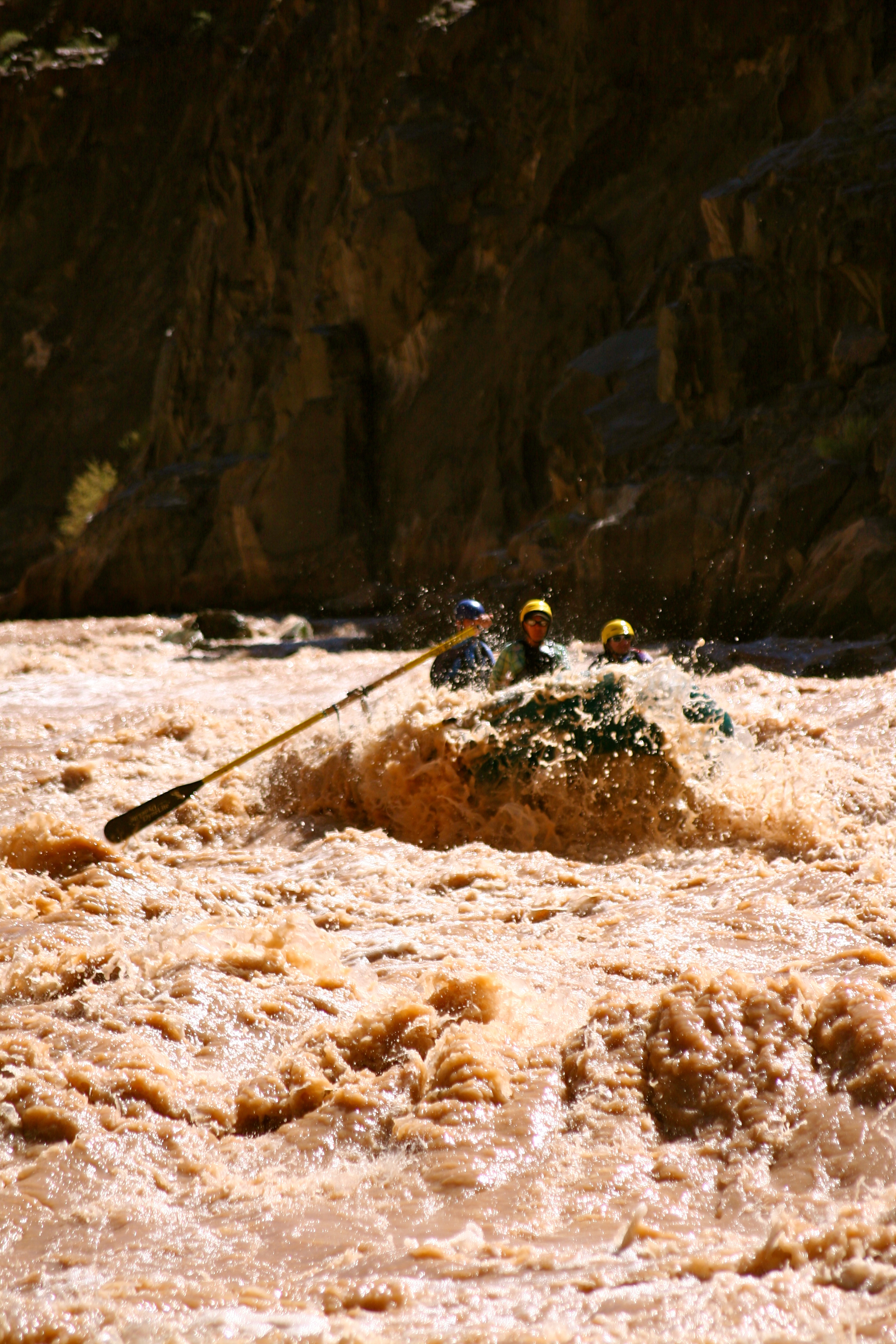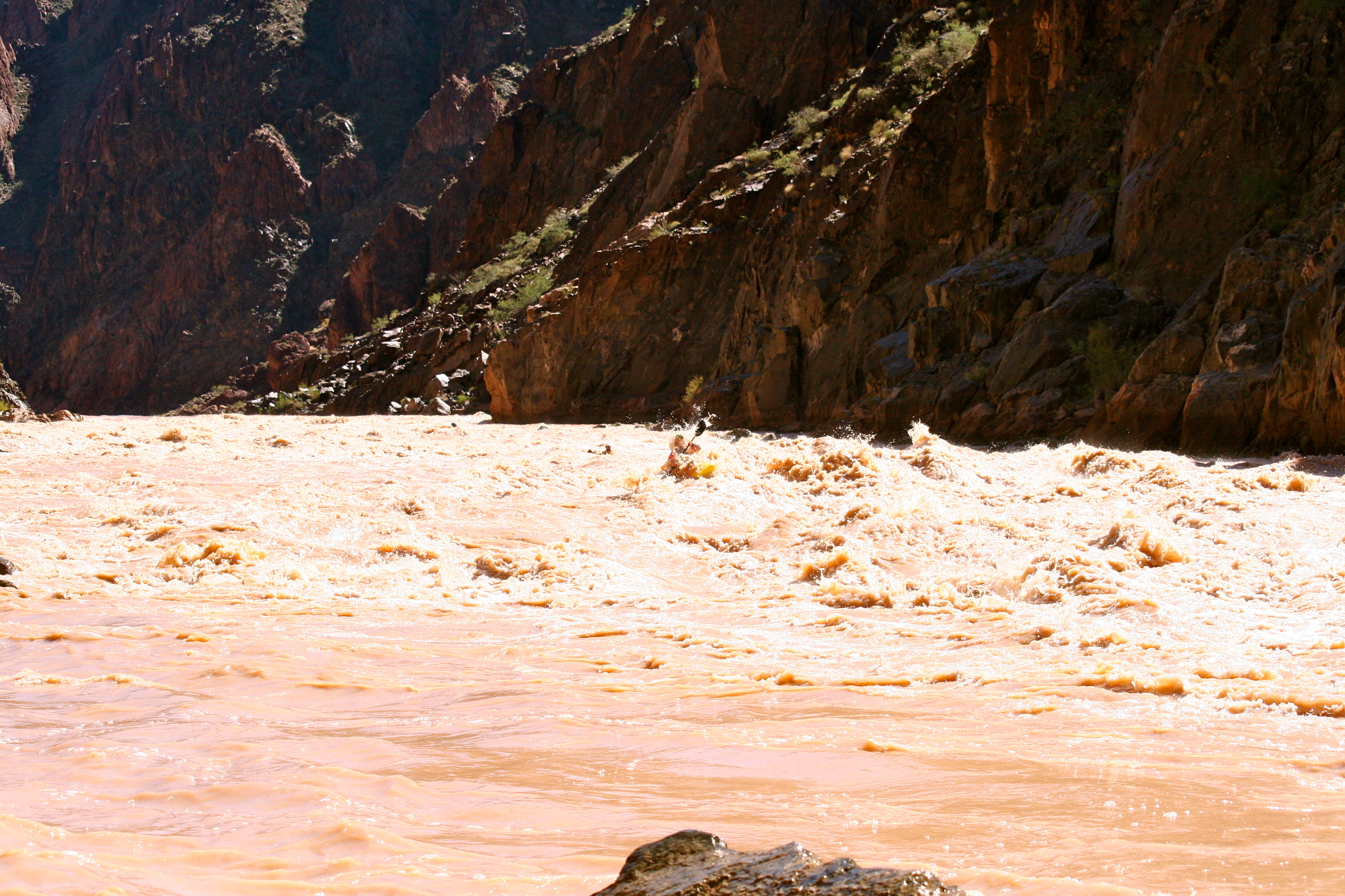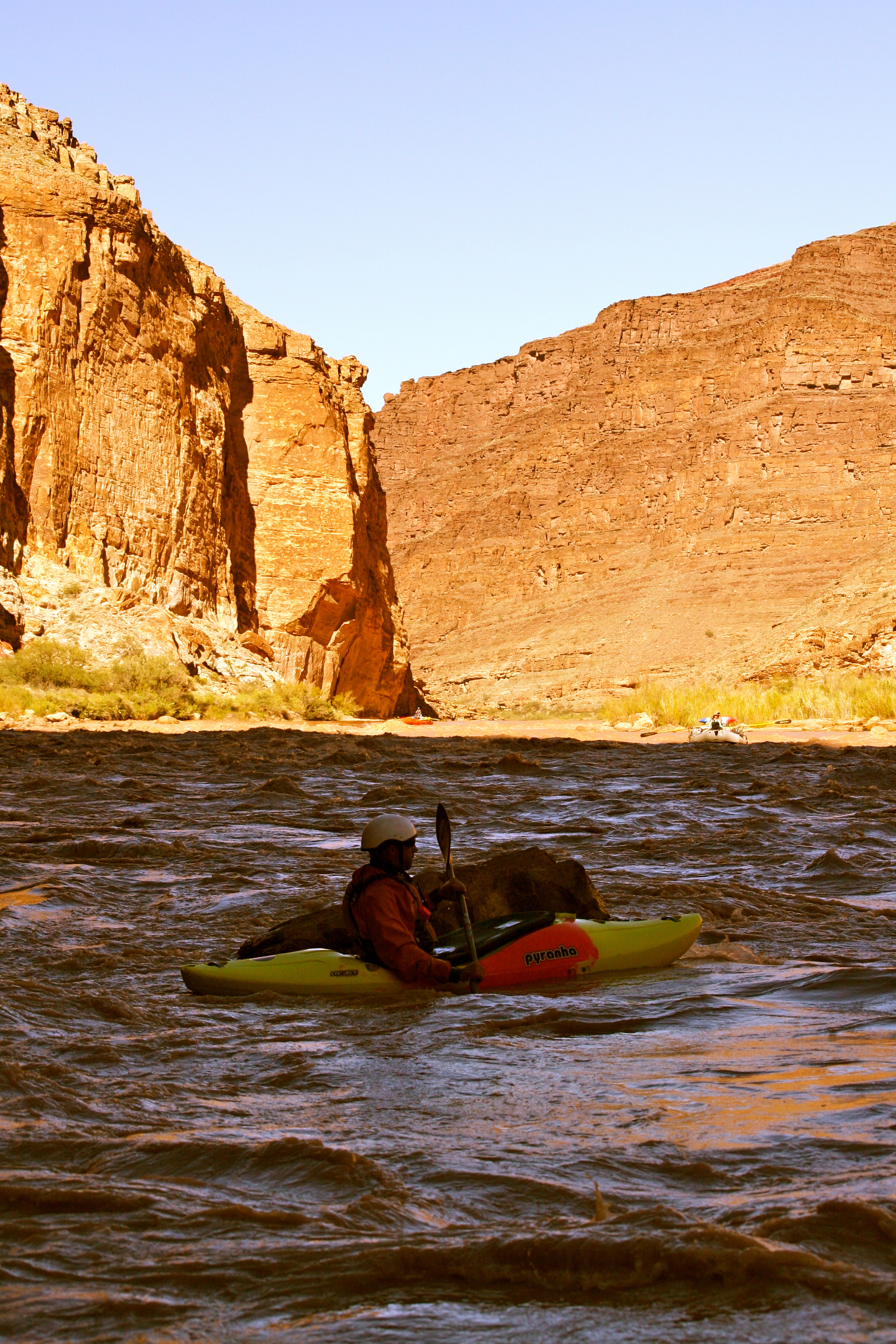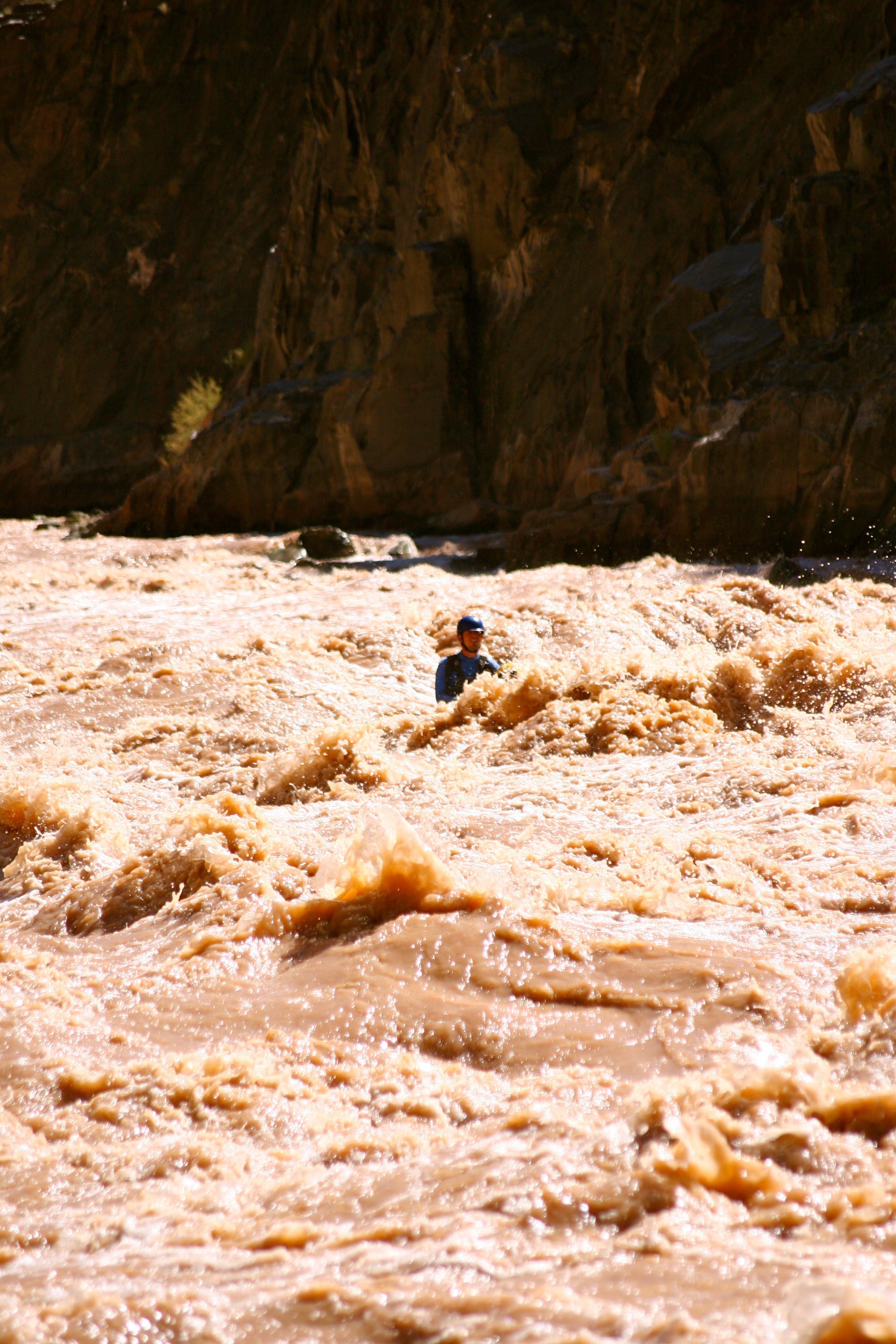 I have heard mixed things about the quality of play on the canyon and I’m sure you will hear contradictions to my assessment but for what it’s worth here are my thoughts on canyon play. There are some rapids where down river play is really good. Wave wheels and kick flips are huge and awesome. However, most of the rapids I found to be very surgey making it hard to predict the waves. The peaks of the waves could disappear on crash on top of you suddenly and unexpectedly. There were some waves that looked like great surf waves but you were coming in so fast it was really hard if not impossible to catch them on the fly and very few had eddy service. There were many times I would come over the top of a wave and see what looked like a good surf hole but it was 10 feet or more to one side or the other and getting to it once I had seen it was not an option. One hole that I did catch turned out to be really shallow. You can’t tell the depth with the muddy water and I ended up plastered to the top of a submerged boulder instead of plugging for a loop. Personally I don’t think it is worth taking a kayak if you have raft support. Just enjoy relaxing on the raft and if you want some real excitement try rowing one of those things through the big rapids. All that said I have friends who say they love playboating the canyon so I guess you’ll just have to find out for yourself.
