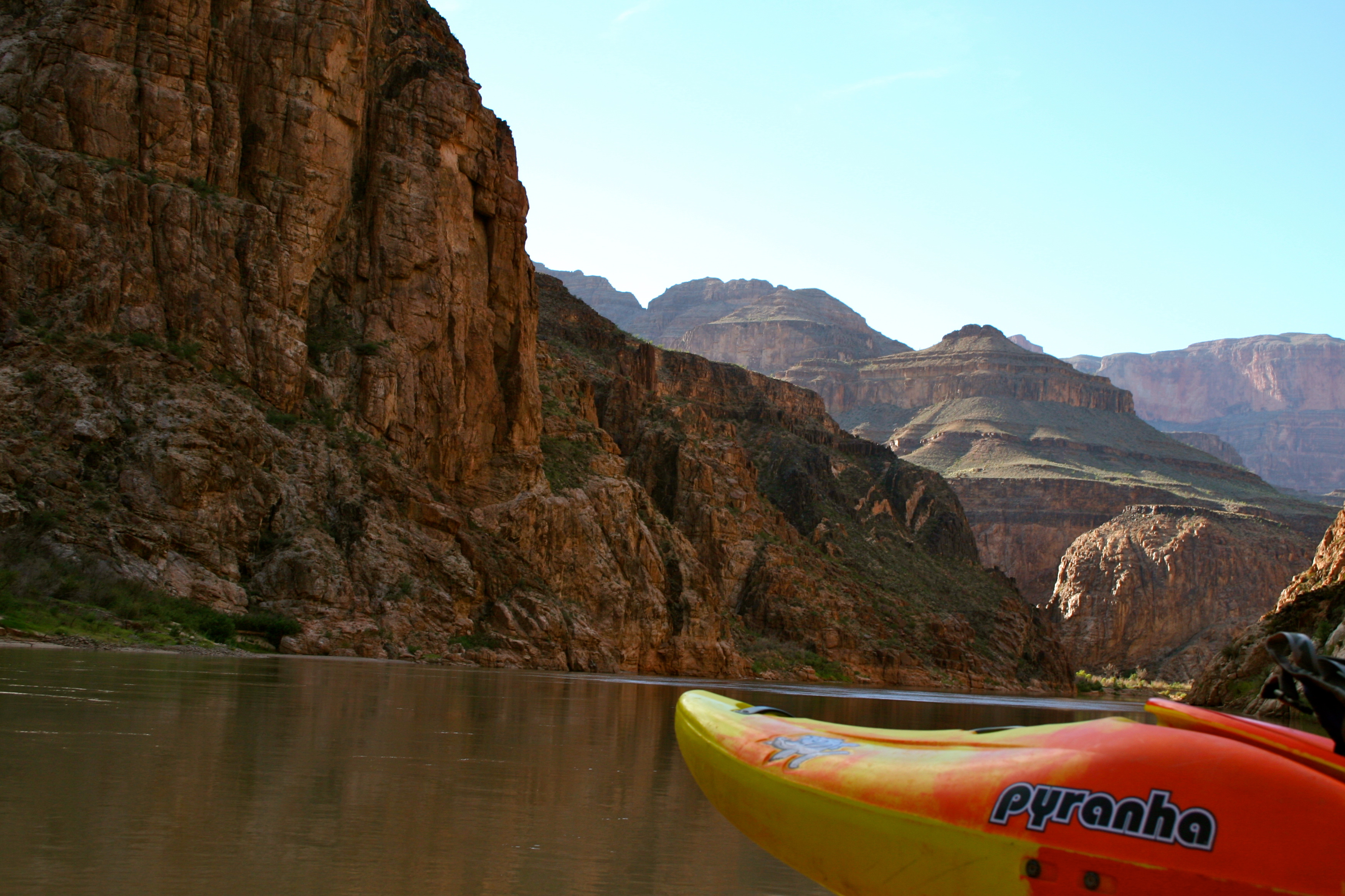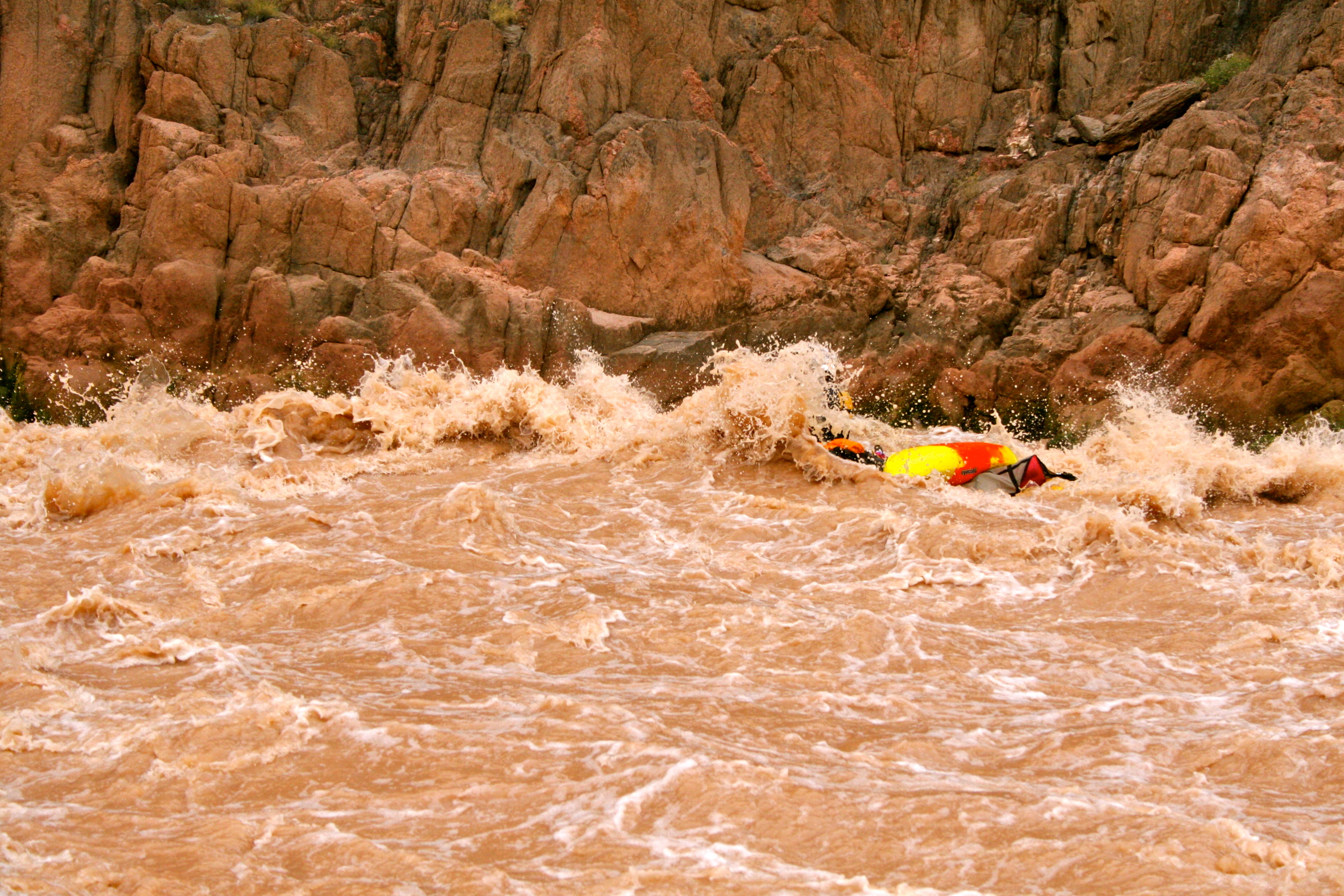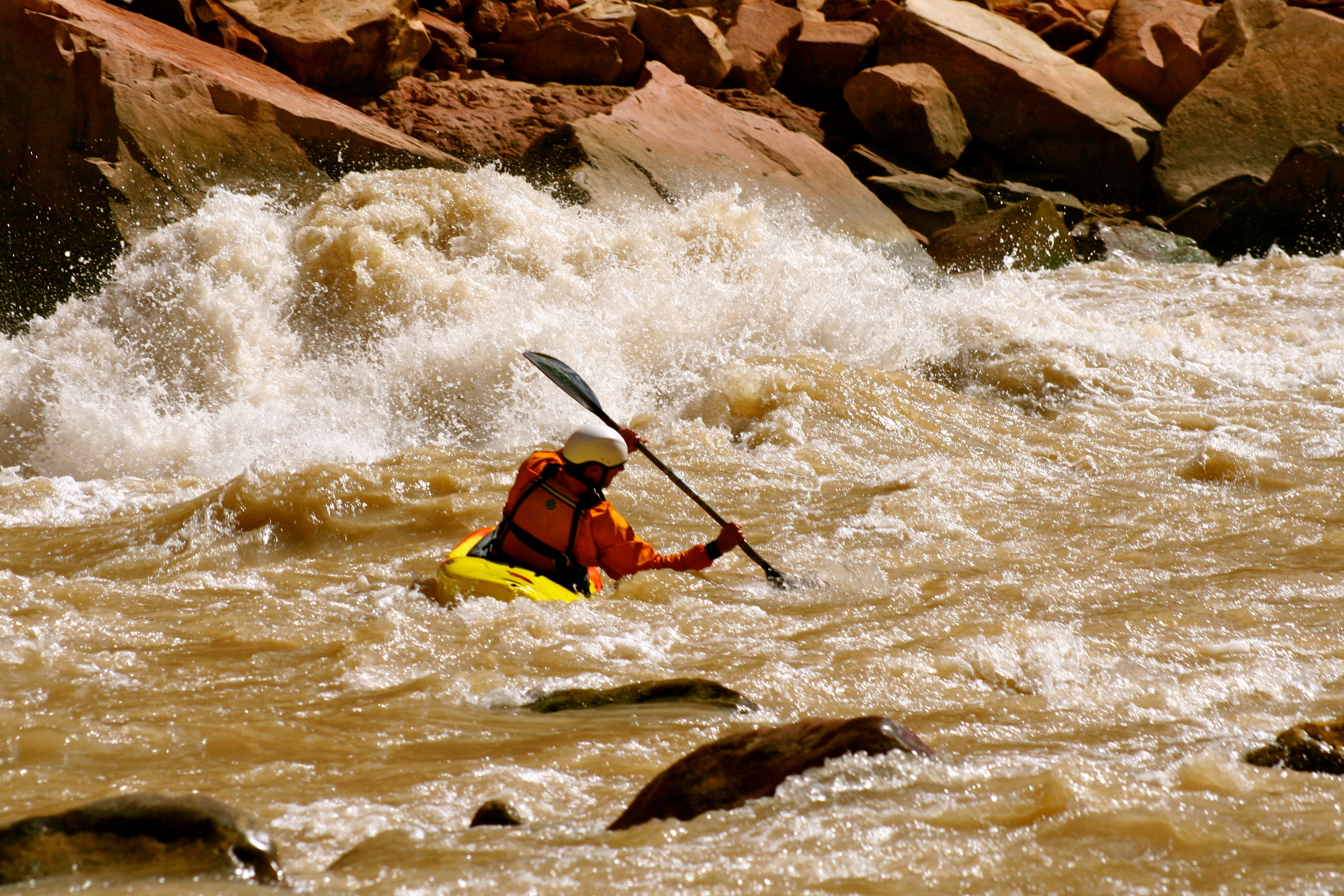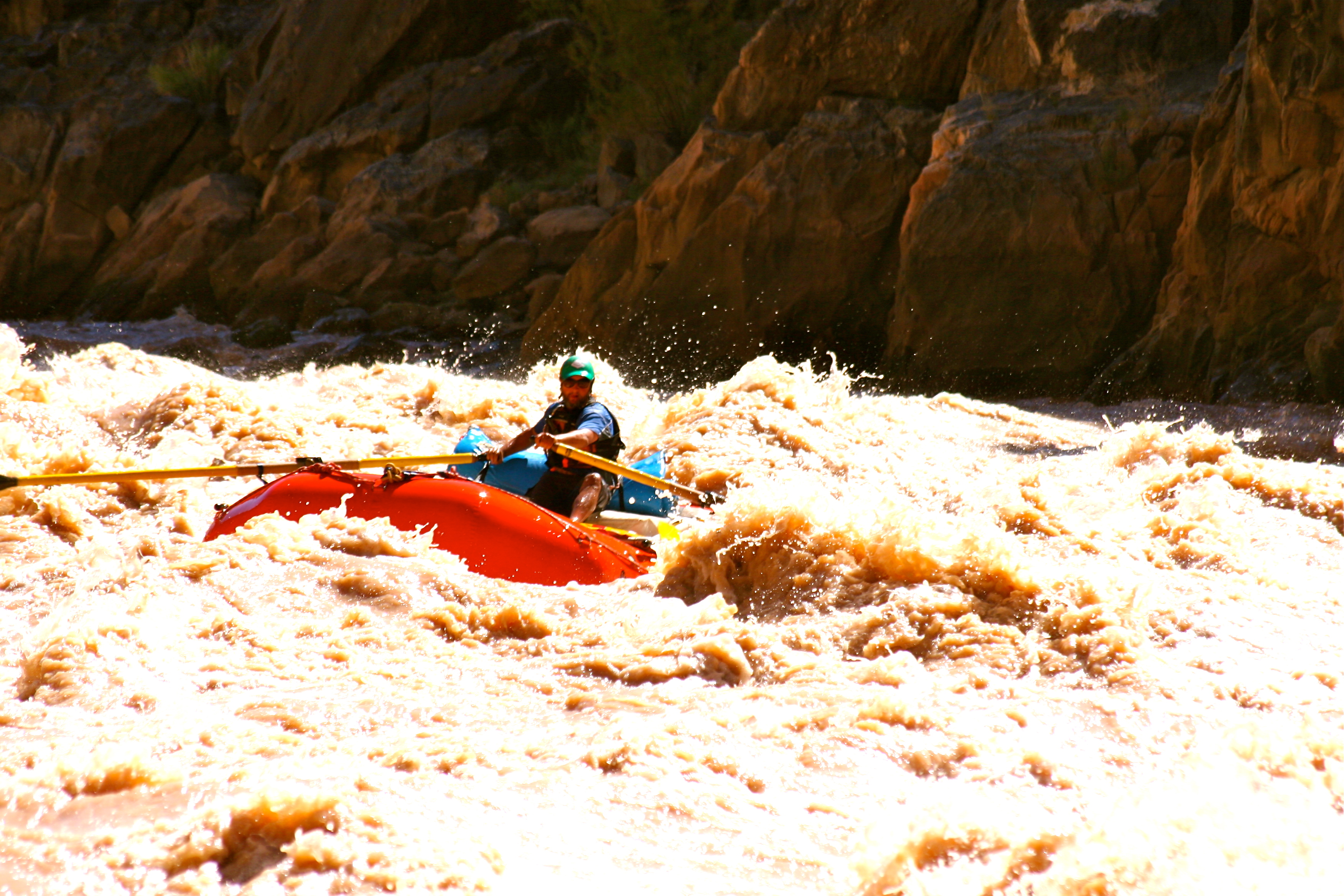 I have heard mixed things about the quality of play on the canyon and I’m sure you will hear contradictions to my assessment but for what it’s worth here are my thoughts on canyon play. There are some rapids where down river play is really good. Wave wheels and kick flips are huge and awesome. However, most of the rapids I found to be very surgey making it hard to predict the waves. The peaks of the waves could disappear on crash on top of you suddenly and unexpectedly. There were some waves that looked like great surf waves but you were coming in so fast it was really hard if not impossible to catch them on the fly and very few had eddy service. There were many times I would come over the top of a wave and see what looked like a good surf hole but it was 10 feet or more to one side or the other and getting to it once I had seen it was not an option. One hole that I did catch turned out to be really shallow. You can’t tell the depth with the muddy water and I ended up plastered to the top of a submerged boulder instead of plugging for a loop. Personally I don’t think it is worth taking a kayak if you have raft support. Just enjoy relaxing on the raft and if you want some real excitement try rowing one of those things through the big rapids. All that said I have friends who say they love playboating the canyon so I guess you’ll just have to find out for yourself.