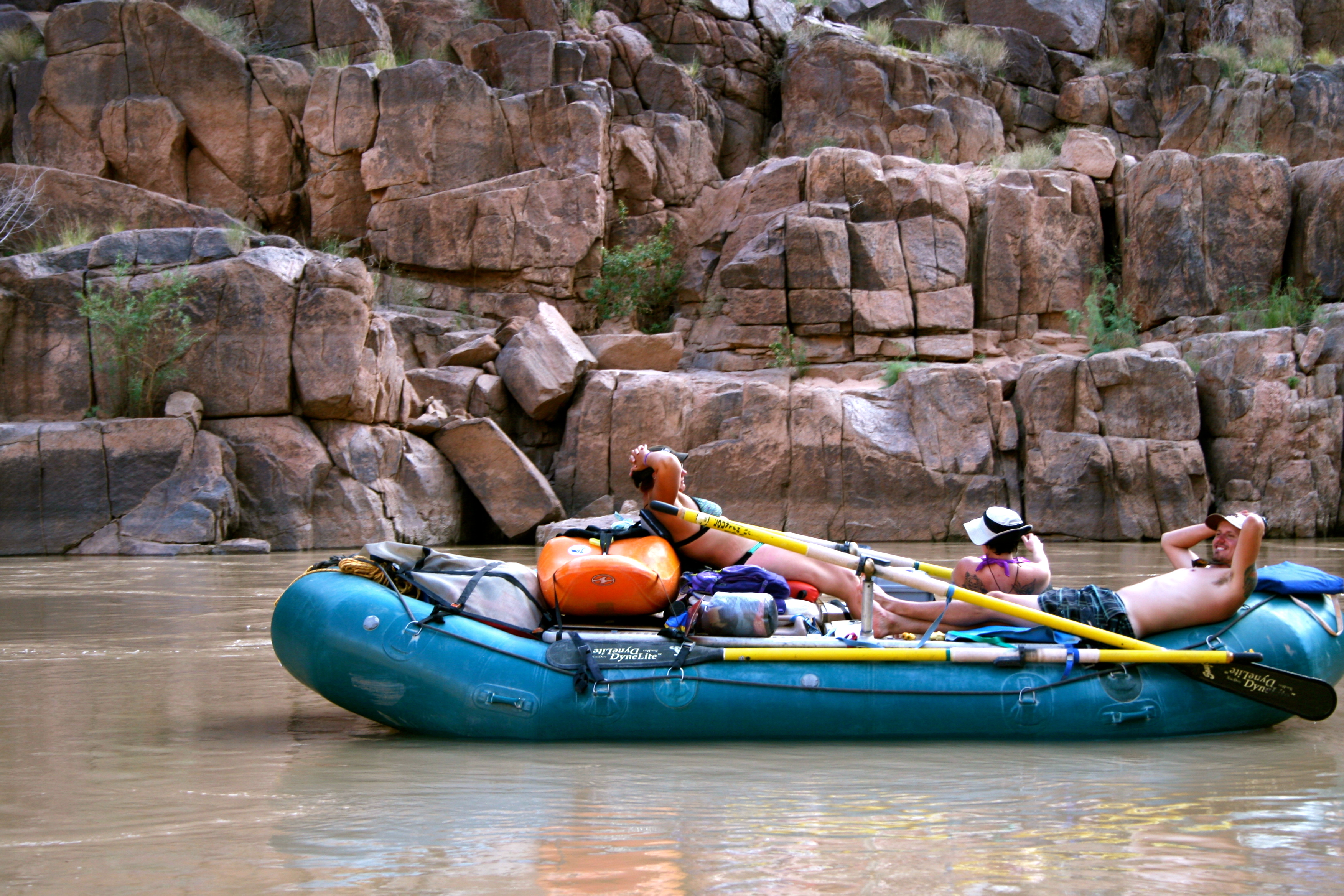 After house our collective confidence in our rowing ability was up, but it would still be tested several more times before we were done. Nearly everyone got some time on the oars and by the end we had a few people who were getting pretty good at it. (Disclaimer: when I say pretty good at rowing I mean compared to the rest of us. I haven’t spent much time around oar boats nor do I really know anything about them so what constitutes good at rowing in general I do not know.) In the beginning those of us who brought kayaks were discussing at the start of each day who “gets” to kayak and who “has” to row. By the end it was more who “gets” to row. For the flat water the raft was definitely the place to be. You could have easy access to food, water, beer, music, and tanning. You could stand up and walk around on the raft or roll out a paco pad and nap. If you were in a kayak you had to paddle to shore and pull all your crap out any time you wanted something and you can’t carry nearly as many beers with you. After a few days the rapids became almost an inconvenience. In the beginning I was stoked for the rapids and just thought I had to get through the flats, but after a few days it was the other way around. This trip is all about the place and the experience. Not so much the big rapids. Don’t worry there are plenty of big rapids but after a few days they’re all the same. The features are enormous but if you’re a skilled kayaker they’re so easy that after a few the novelty of their size wears off and there is no challenge. It is fun to paddle a play boat up a wave where you can take 5 strokes up the face and do a huge wave wheel off the top though.